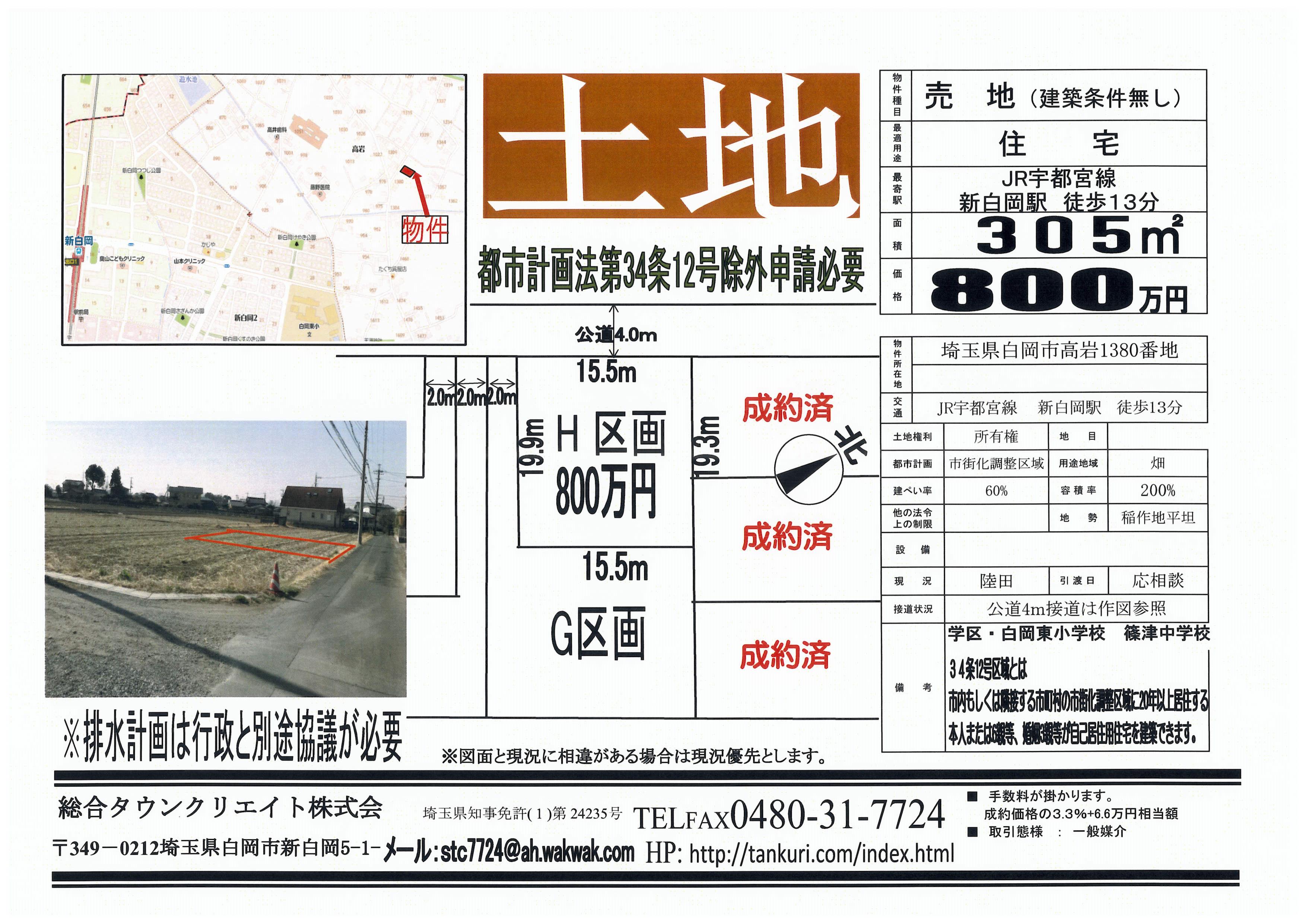 白岡市高岩 調整区域土地 地目宅地 農地除外は不要 開発から 310㎡