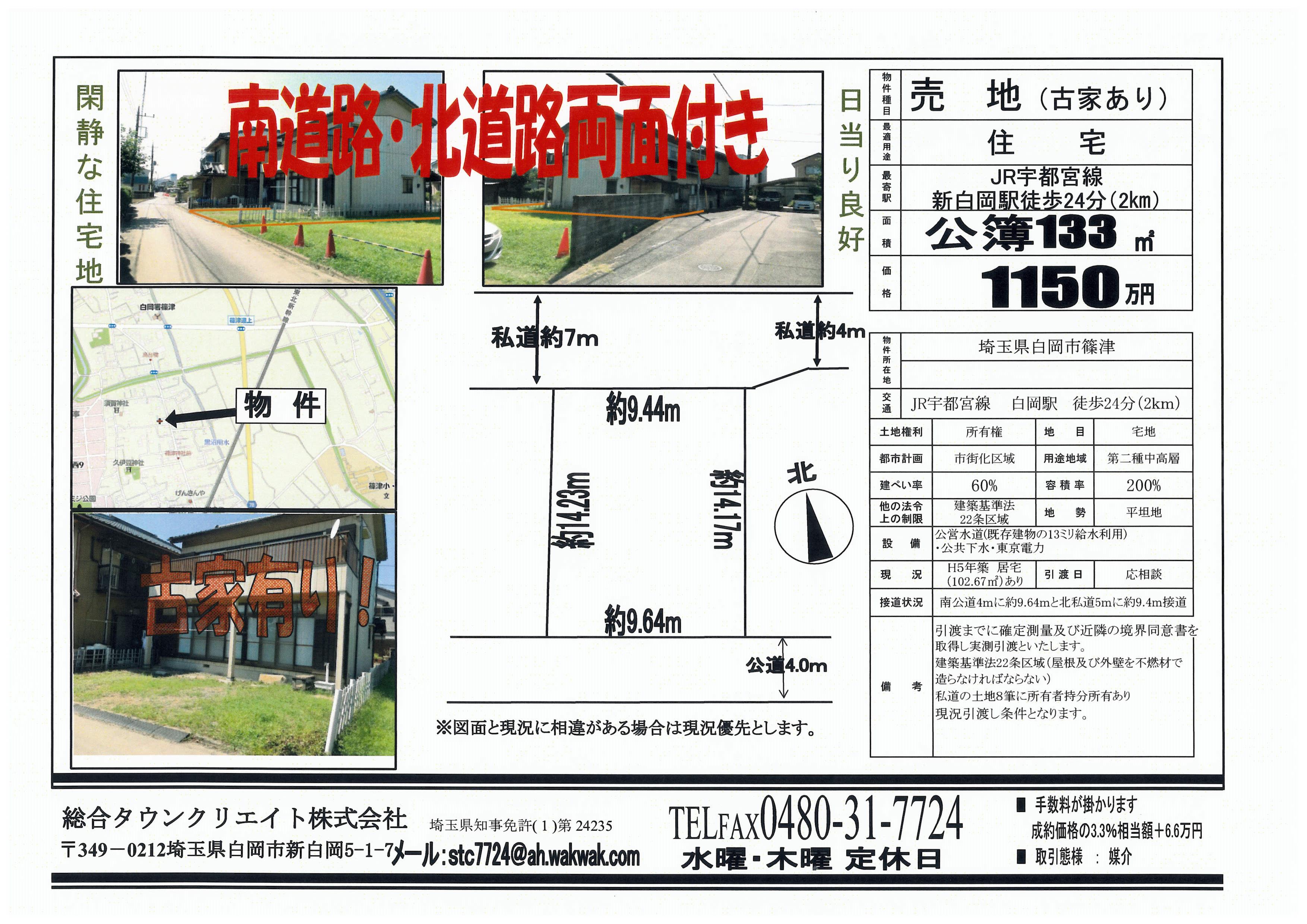 白岡ニュータウン内駅徒歩9分 古家付き土地 180.48㎡ 東西両面道路付き